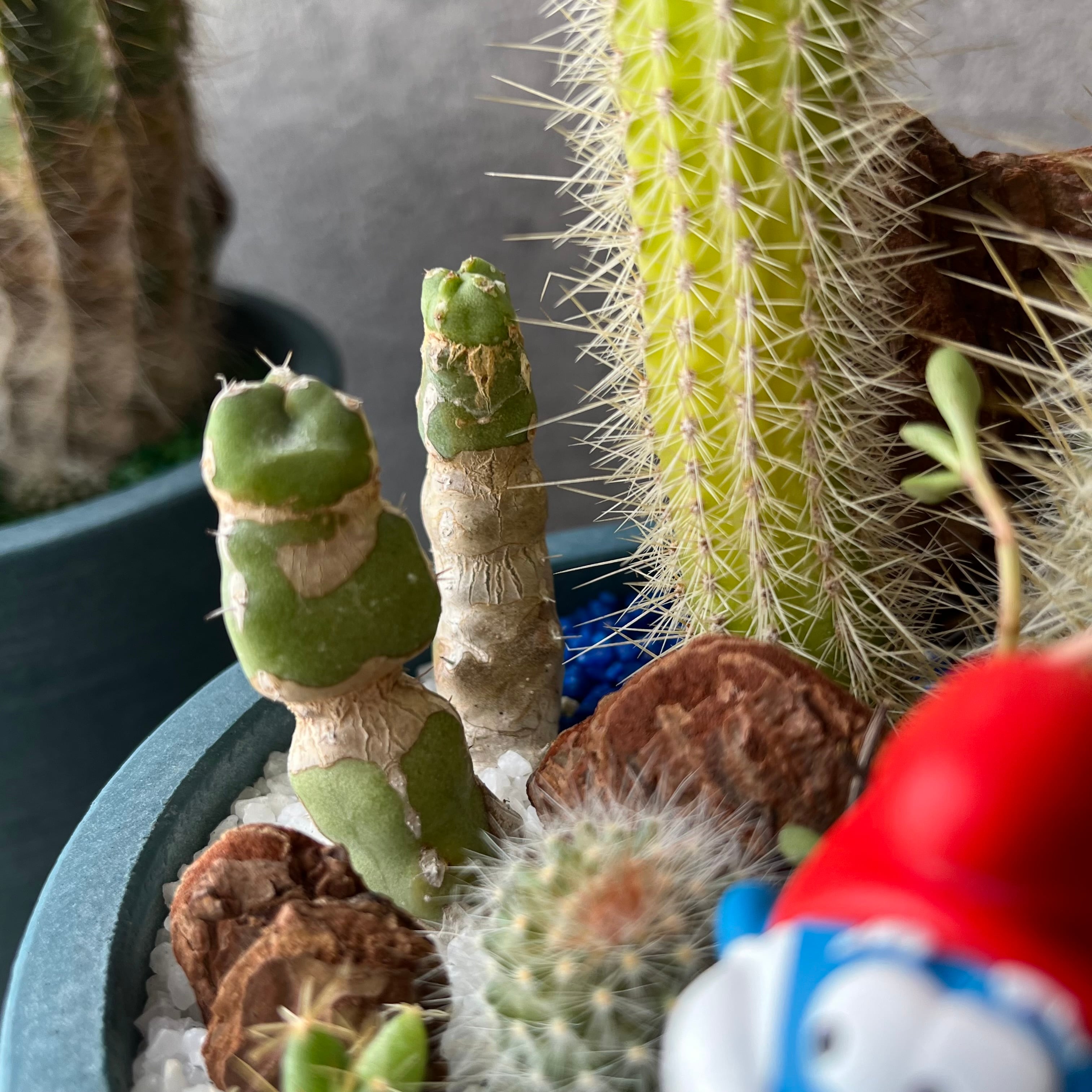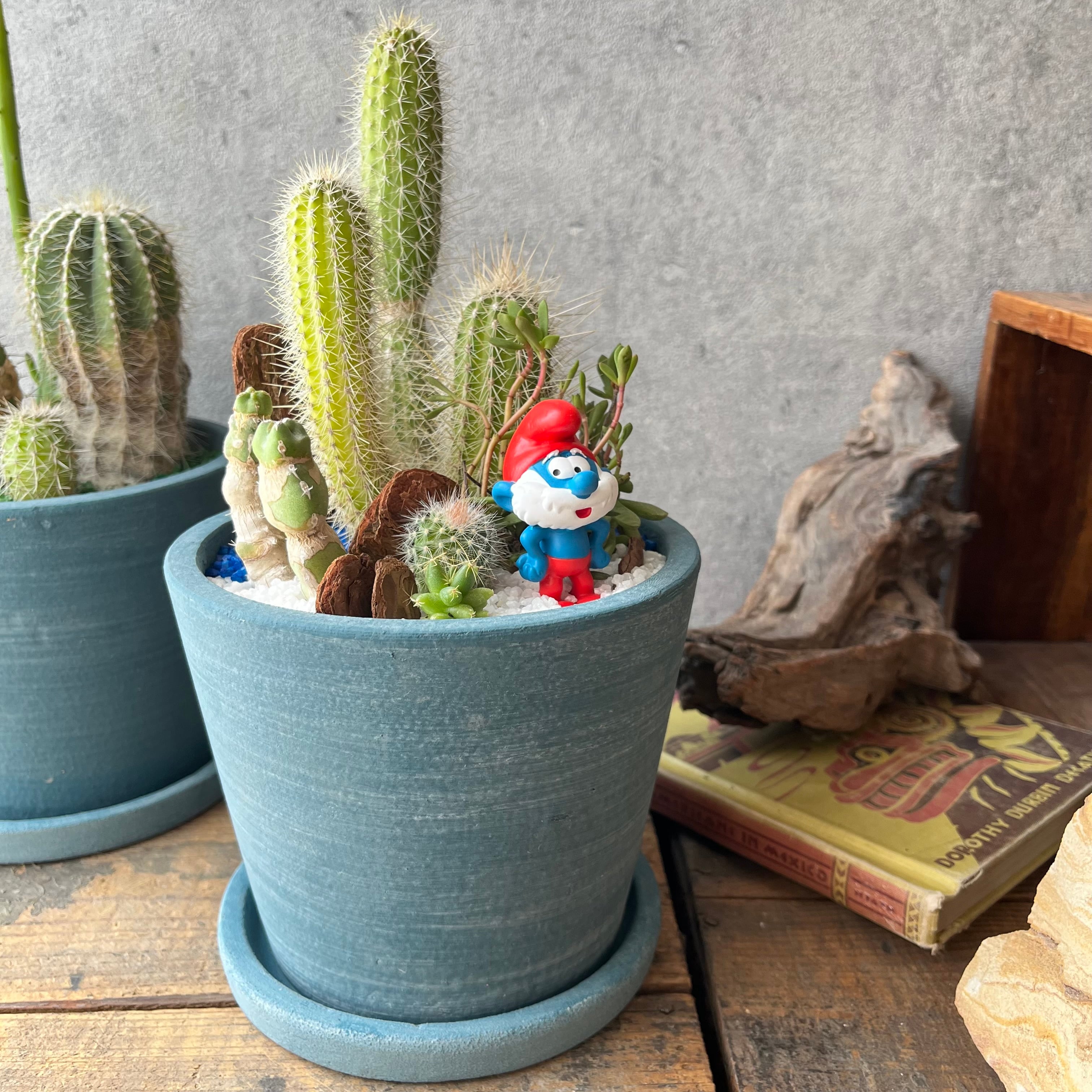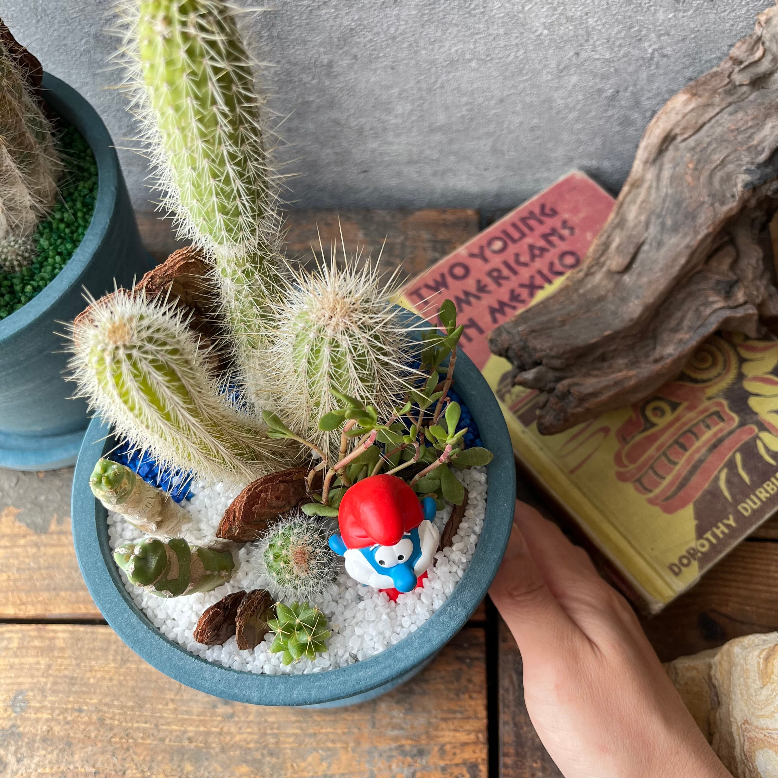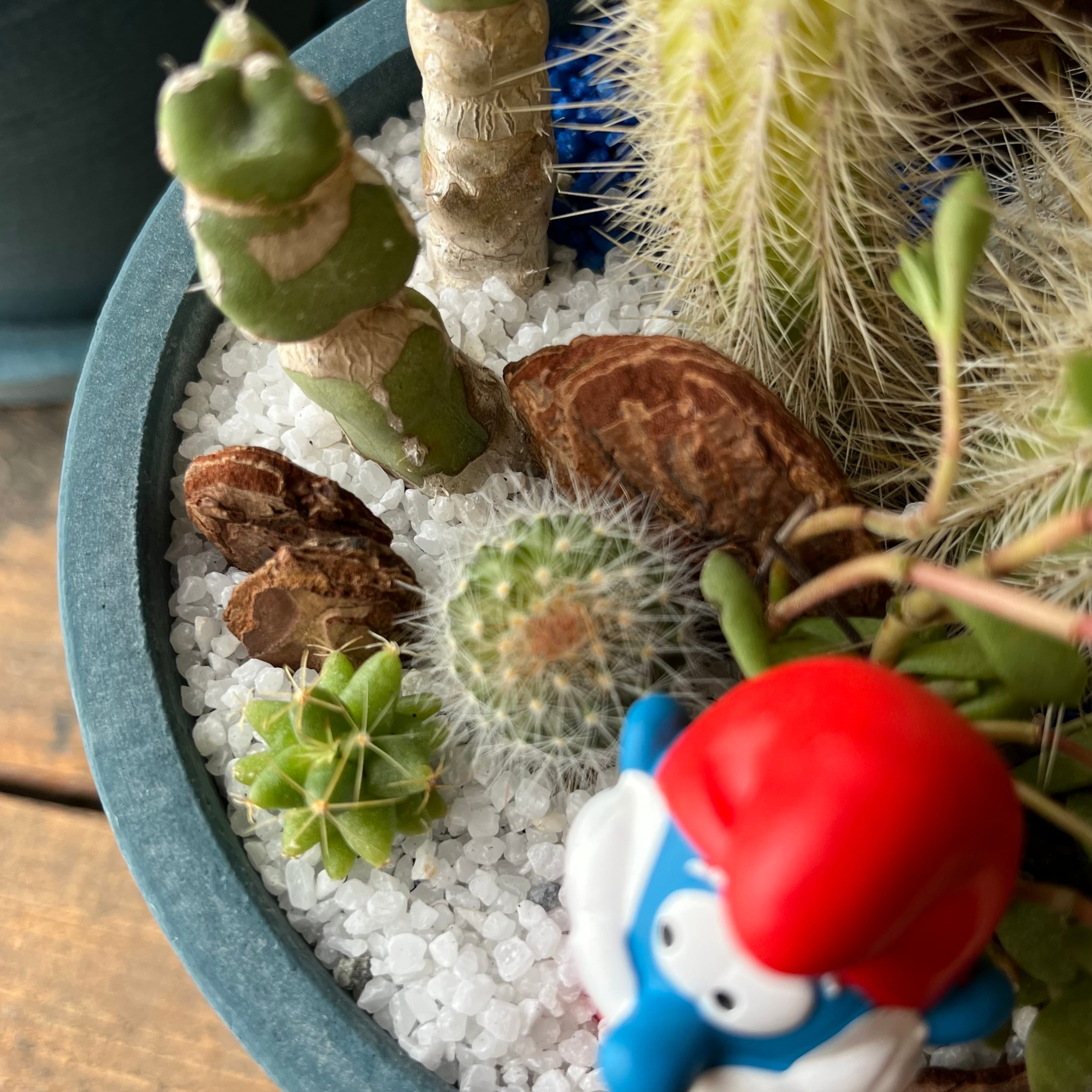 青い鉢に植え、表面のサンドは白。ニョキニョキ伸びる多肉やユーフォルビアなど