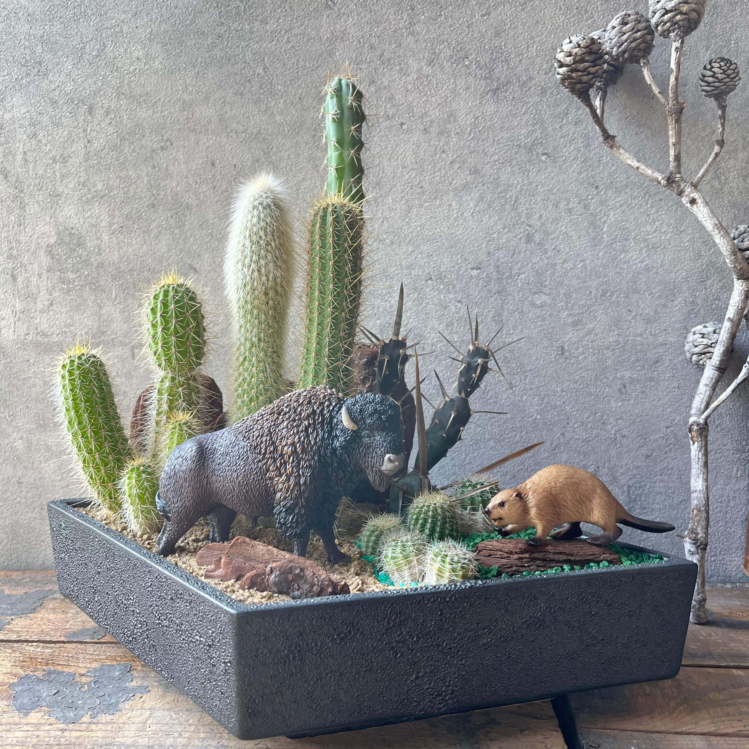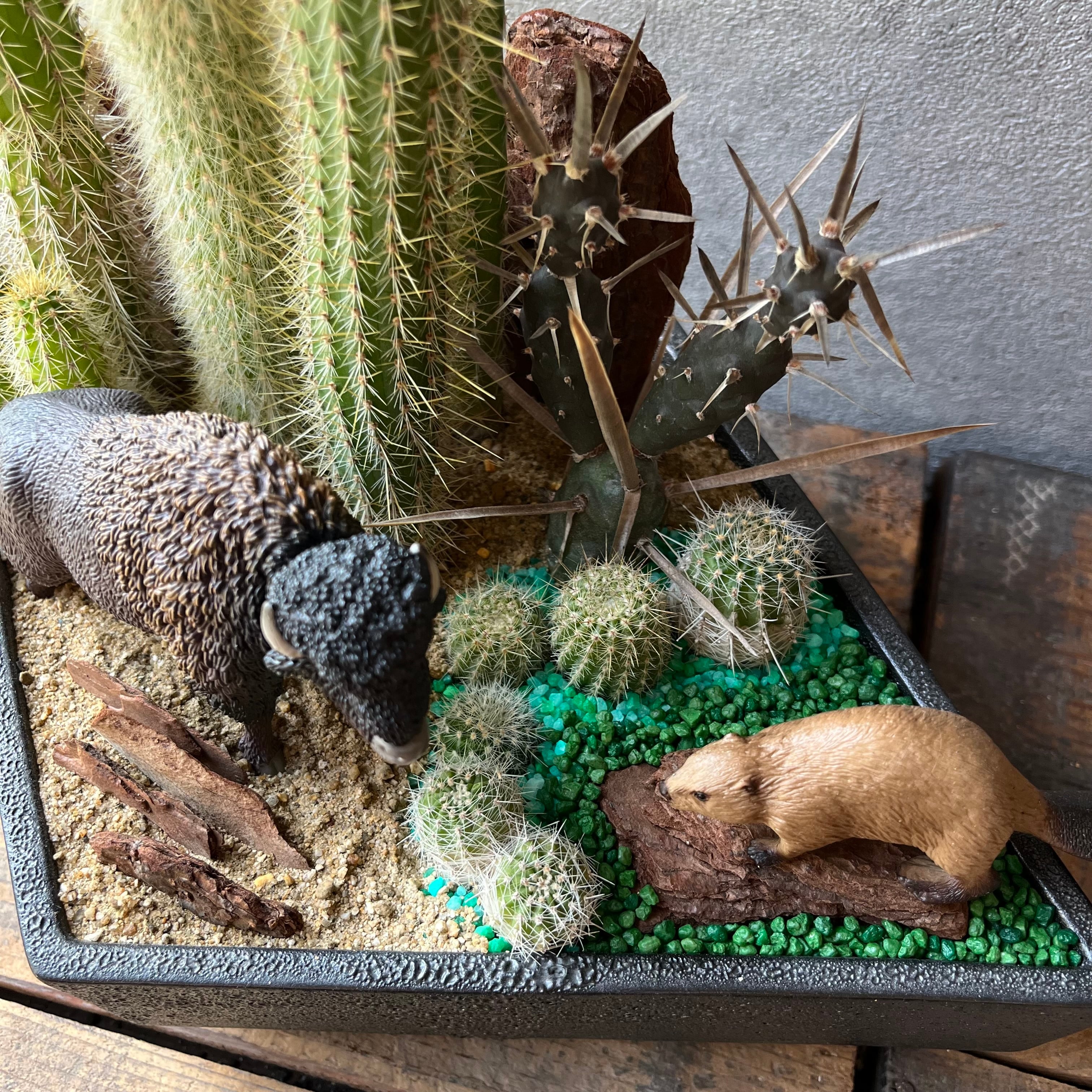 当店のジオラマアレンジは、1つ1つに世界観を作り込み、お気に入りをたくさん並べたくなる様な、ユニークな作品を目指しています。