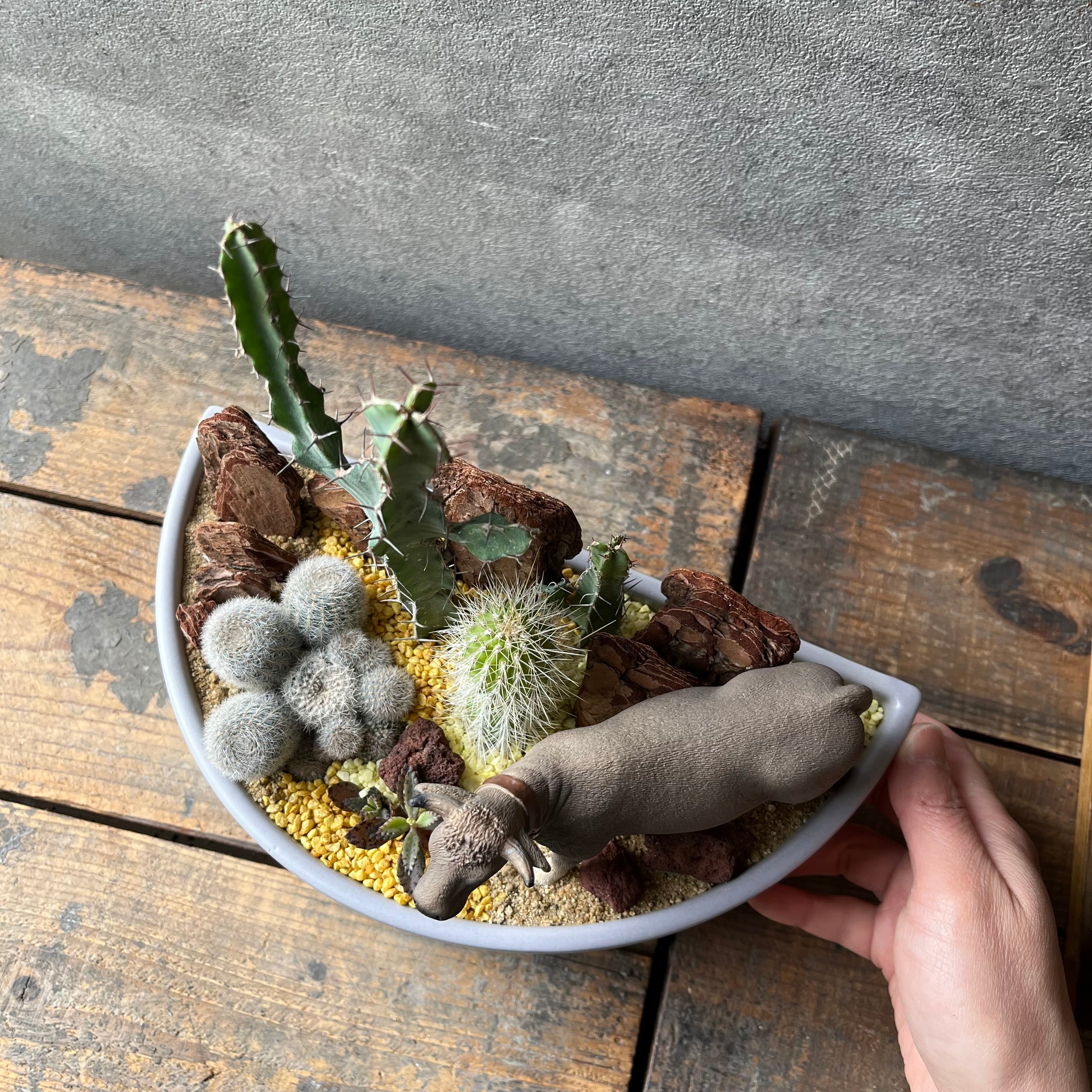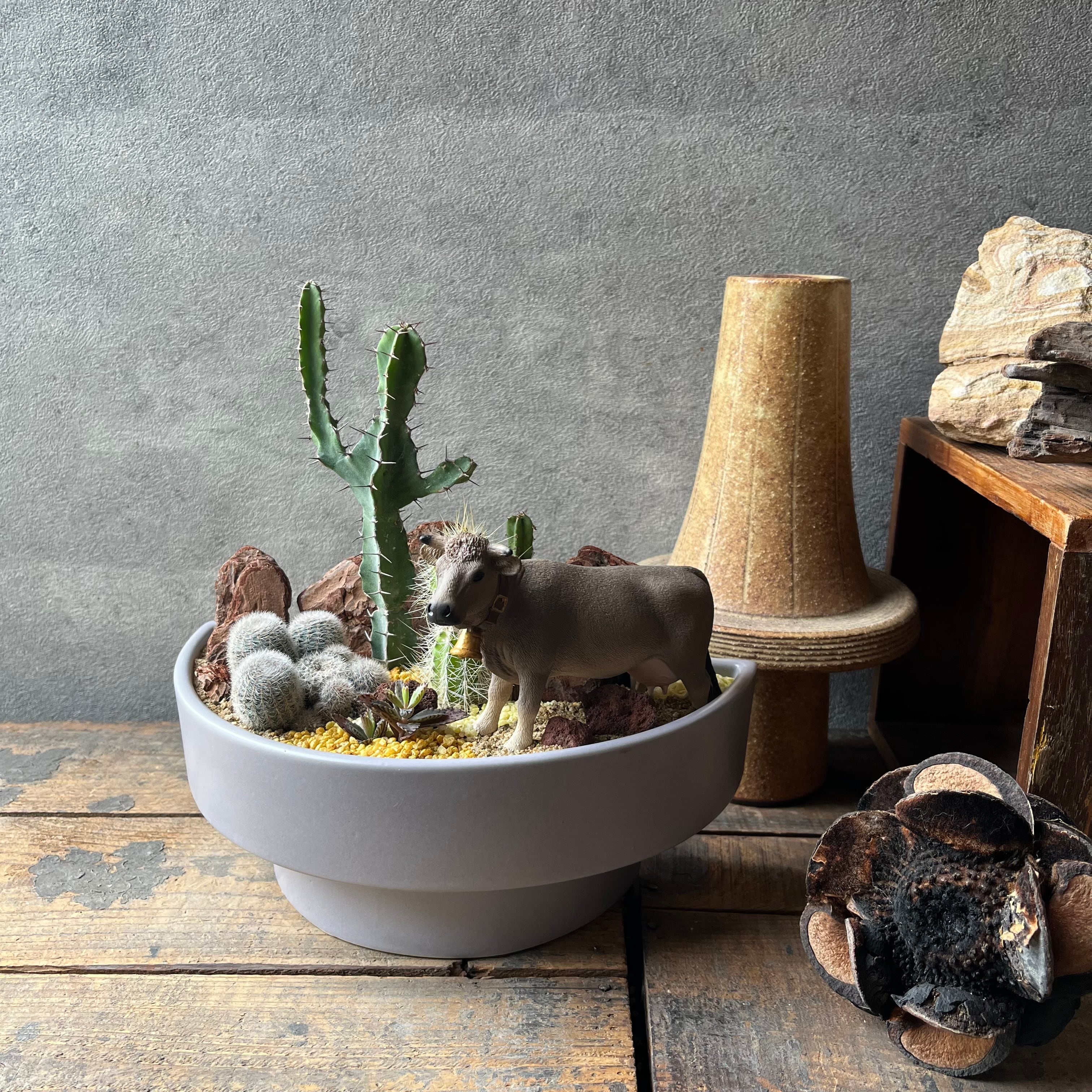 目線の高さを変えてみると動物の表情が全然違って印象が変わったり、覗き込むと奥に渓谷や雪山が見えてきたり。その動物の生息地の植物を使ったり、自然の厳しさを落とし込んで、よりリアルに作り込んだり。時には器の個性を第一に活かして作ったりもします。